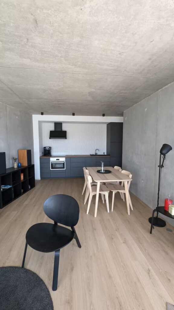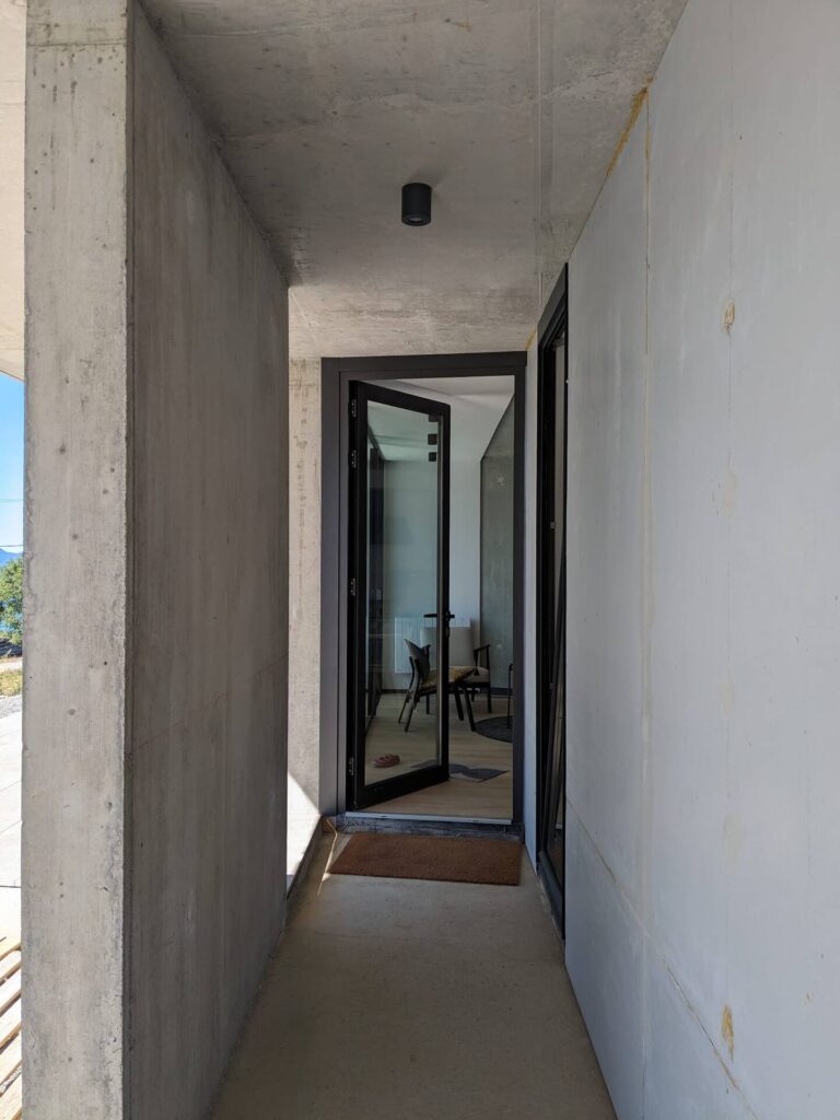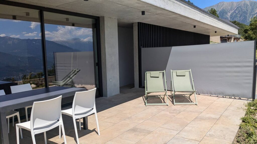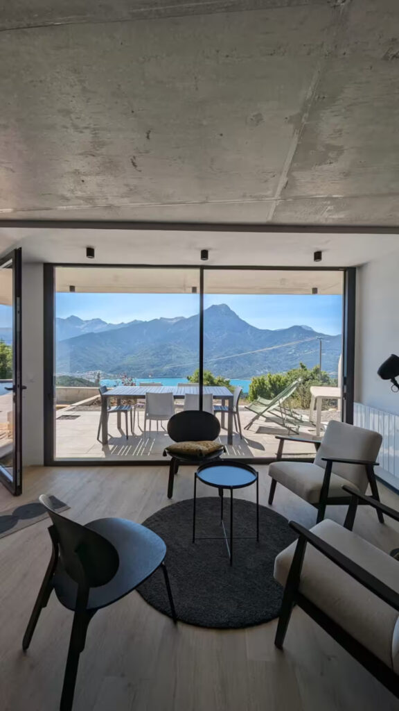– d’un living avec cuisine équipée, disposant d’une large baie vitrée donnant sur une terrasse privative plein sud, avec vue sur les montagnes et le lac ;