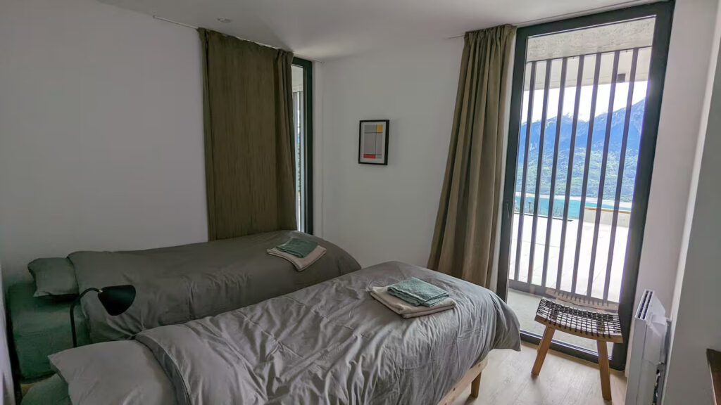 – de mi juin à mi septembre, d’un accès direct à la piscine chauffée (partagée avec la maison) avec vue sur le lac (bassin de nage : sans sel, ni chlore, ni autre produit chimique).